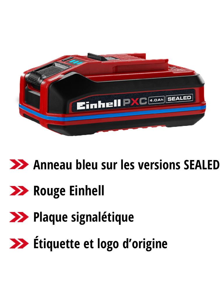 Nous recevons de plus en plus souvent des informations sur des batteries contrefaites qui seraient compatibles avec nos appareils Einhell. Nous déconseillons l'achat d'une telle « batterie de rechange » ou d'une batterie marquée comme « compatible avec Power X-Change ». Il s'agit de copies d'autres fabricants qui présentent certains dangers. En effet, seule la batterie originale Einhell Power X-Change t'offre la qualité et la sécurité dont tu as besoin lorsque tu travailles avec ton outil sans fil ou ton appareil de jardinage sans fil Einhell.