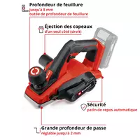 Avec le rabot sans fil TE-PL 18/82 Li-Solo, tout bricoleur amateur ou expérimenté travaillant le bois dispose d’un puissant rabot à main pour des applications jusqu’à 2 mm de profondeur de passe. L’arbre porte fers de grande dimension assure une performance de rabotage optimale, et la semelle en aluminium massif garantit une planéité parfaite. La semelle est en outre dotée d’une rainure en V pour faciliter le chanfreinage. Le patin de repos automatique protège les pièces et les fers. La poignée ergonomique assure une prise en main sûre et ferme et une utilisation sans effort. Le revêtement Softgrip permet de manipuler le rabot sans fil en tout confort. Sont fournis de série une butée parallèle pour des travaux de rabotage droits et précis, ainsi qu’une butée de profondeur de feuillure pour réaliser facilement des angles rentrants. Un fer TCT (réversible) est également inclus et garantit une excellente qualité de surface. Le rabot appartenant à la gamme Power X-Change, il est compatible avec toutes les batteries de cette même gamme. Des batteries 2,5 Ah Plus ou supérieures sont recommandées pour un fonctionnement optimal. L'outil est vendu sans batterie ni chargeur (disponibles séparément).