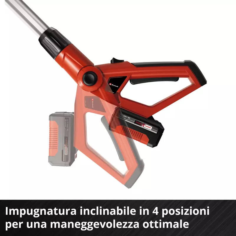 Il tagliasiepi telescopico a batteria GE-HH 18/45 Li T è un apparecchio molto potente e un valido assistente nella cura di siepi, cespugli e arbusti in terreni di ampie dimensioni e in orti senza la necessità di corrente elettrica. Gli ingranaggi in metallo sono resistenti all’usura e le lame realizzate in acciaio tagliato al laser e diamantato consentono di ottenere sempre risultati di taglio eccellenti. Il robusto manico telescopico in alluminio è regolabile in continuo all'altezza desiderata e può essere bloccato. L'impugnatura supplementare, anch'essa regolabile in continuo in base alle esigenze dell'utente, è dotata di una pratica chiusura rapida. Per realizzare con precisione anche difficili tagli verticali e orizzontali in altezza, il tagliasiepi è dotato di testina motorizzata inclinabile in 7 posizioni e di impugnatura principale inclinabile in 4 posizioni, permettendo quindi di adattarsi a qualsiasi situazione. La robusta custodia del tagliasiepi elettrico è l’ideale per riporre l’apparecchio e per il suo trasporto. Nella fornitura di consegna, la batteria e il caricabatteria non sono inclusi.