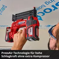 Der Einhell Professional Akku-Nagler FIXETTO 18/50 N befördert Nägel mit hoher Schlagkraft in das jeweilige Material. Der Stiftnagler arbeitet mit der sogenannten PressAir-Technology. Dabei wird Luft direkt im Gerät komprimiert, um mit dem entstehenden Druck den Nagel zu "schießen". Im Vergleich zu anderen Nagelpistolen werden dazu weder ein Kompressor, noch Gaskartuschen oder Ähnliches benötigt. Es entstehen keine extra Kosten oder Wartungsaufwand.